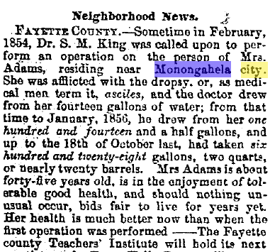 FAYETTE COUNTY – Sometime in February, 1854, Dr. S.M. King was called upon to perform an operation on the person of Mrs. Adams, residing near Monongahela city. She was afflicted with the dropsy, or, as medical men term it, asciles, and the doctor drew from her fourteen gallons of water; from that time to January, 1856, he drew from her one hundred and fourteen and a half gallons, and up to the 18th of October last, had taken six hundred and twenty-eight gallons, two quarts, or nearly twenty barrels. Mrs. Adams is about forty-five years old, is in the enjoyment of tolerable good health, and should nothing unusual occur, bids fair to live for years yet. Her health is much better now than when the first operation was performed.