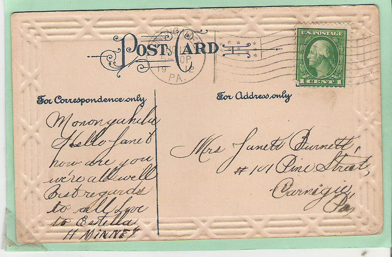 A post card currently up for sale on eBay, dated 1912 from H. Minney to Mrs. Janet Burnett of Carnegie, PA. Click each image for a larger view.