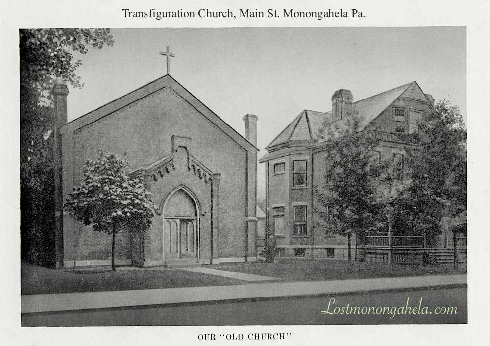 Anybody living in the Monongahela area is familiar with the beautiful Transfiguration church (now named St. Damien of Molokai) located on West Main Street.  I knew that an earlier church building once stood on this site but I never had seen any pictures of it so I was thrilled to discover this photo of the original structure.