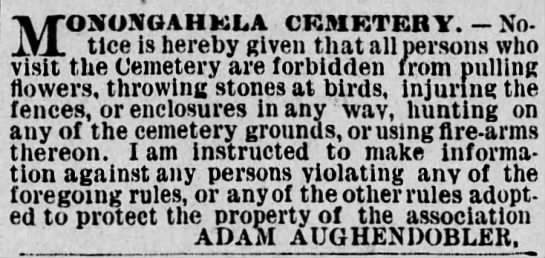 MONONGAHELA CEMETERY. – Notice is hereby given that all persons who visit the Cemetery are forbidden from pulling flowers, throwing stones at birds, injuring the fences, or enclosures in any way, hunting on any of the cemetery grounds, or using fire-arms thereon. I am instructed to make information against any persons violating any of the foregoing rules, or any of the other rules adopted to protect the property of the association. ADAM AUGHENDOBLER.