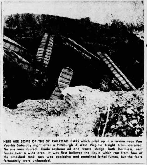 The train originated in Chicago and derailed in an interchange yard used by the Donora Southern railroad. Approximately 100 families along Pigeon Creek section of Monongahela, Frye Station, Hazel Kirk, Crackerjack and Van Voorhis. were forced to evacuate their homes until an all clear came from a bureau of mines chemical inspector at approximately 11:30 p.m.